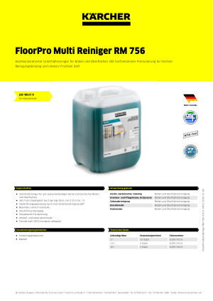 Die hochnetzende Formulierung des FloorPro Multi Reinigers RM 756 von Kärcher bietet eine Fülle von Vorteilen bei der genauso gründlichen wie materialschonenden maschinellen oder manuellen Unterhaltsreinigung aller wasserbeständigen, harten und elastischen (ESD-)Böden und Oberflächen. Dank der speziellen Tensidkombination eignet sich das vielseitige Reinigungsmittel besonders auch für hydrophobe Oberflächen, wie beispielsweise PUR-beschichtete Bodenbeläge. Es sorgt dabei nicht nur für eine extra hohe Reinigungsleistung, indem es Fett-, Öl- und Mineralverschmutzungen wirkungsvoll aufnimmt, sondern auch für eine gleichmäßige, streifenfreie und schnelle Trocknung. Für eine effiziente Nutzung des Tankvolumens von Scheuersaugmaschinen ist der FloorPro Multi Reiniger RM 756 schaumarm eingestellt und hinterlässt nach der Reinigung einen angenehmen und lang anhaltenden Duft. Profis in der Gebäudereinigung profitieren dazu von einer hohen Anwendersicherheit des kennzeichnungsfreien Hochkonzentrats.