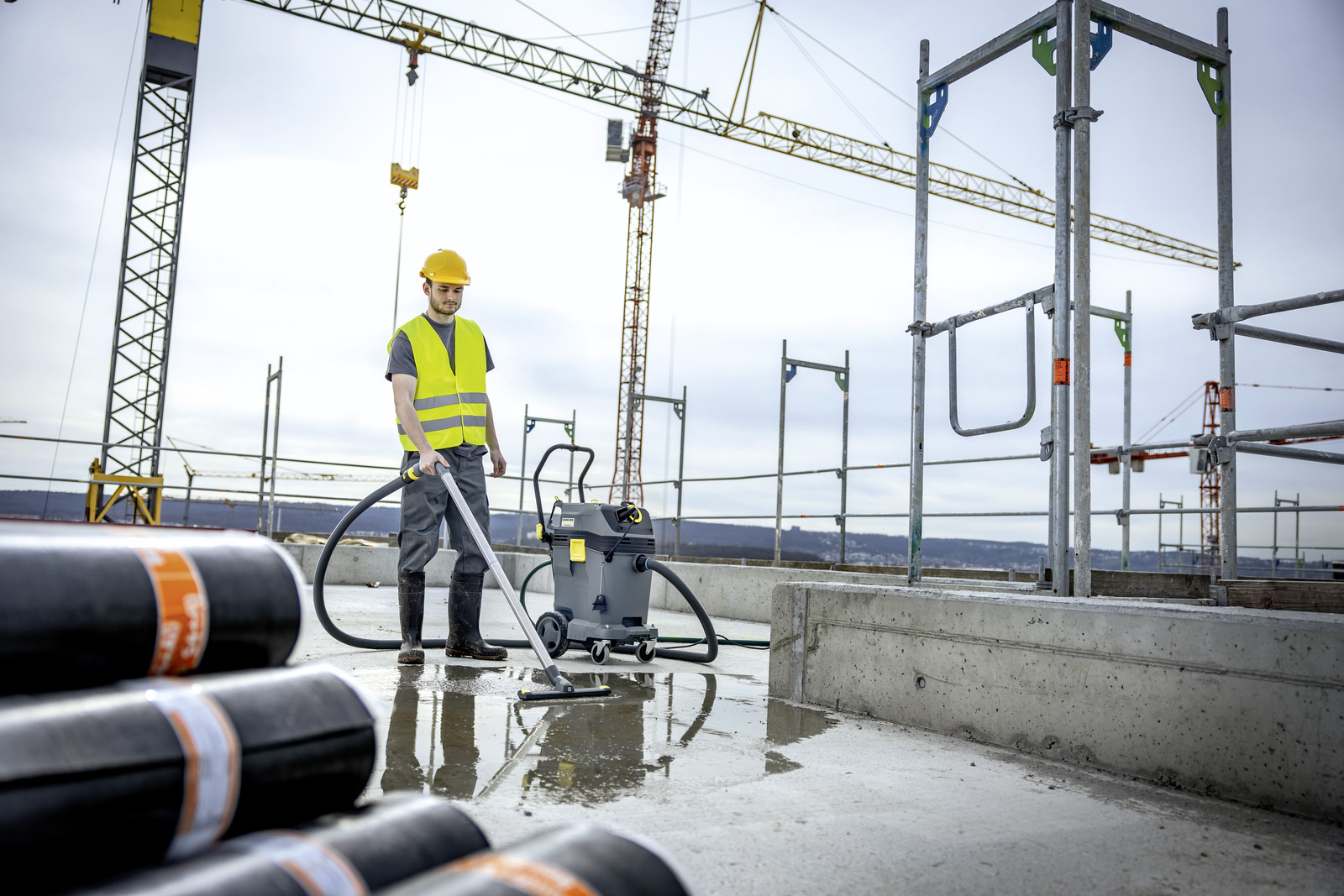Ob auf Baustellen oder in Industriebetrieben: Der Nass-/Trockensauger NT 50/1 K von Kärcher ist speziell zur schnellen Beseitigung großer Wassermengen ausgelegt. Dank seiner leistungsstarken Entsorgungspumpe meistert er pro Minute über 300 Liter Schmutzwasser, inklusive des darin befindlichen Grobschmutzes bis zu Korngrößen von 20 Millimetern. Die serienmäßige Geka-Kupplung gewährleistet dabei seine Kompatibilität mit diesem weitverbreiteten Kupplungssystem für Wasserschläuche. Turbine und Entsorgungspumpe werden durch effektive Grobschmutzfilter vor angesaugten Kleinteilen, Steinen, Laub oder Resten von Baumaterial, vor Beschädigungen bzw. Verstopfung geschützt. Metall-Lenkrollen am robusten 50-Liter-Behälter und ein stufenlos einstellbarer Schubbügel sorgen für hohe Mobilität und einen mühelosen Transport des Saugers NT 50/1 K vom Fahrzeug zum Einsatzort und wieder zurück.